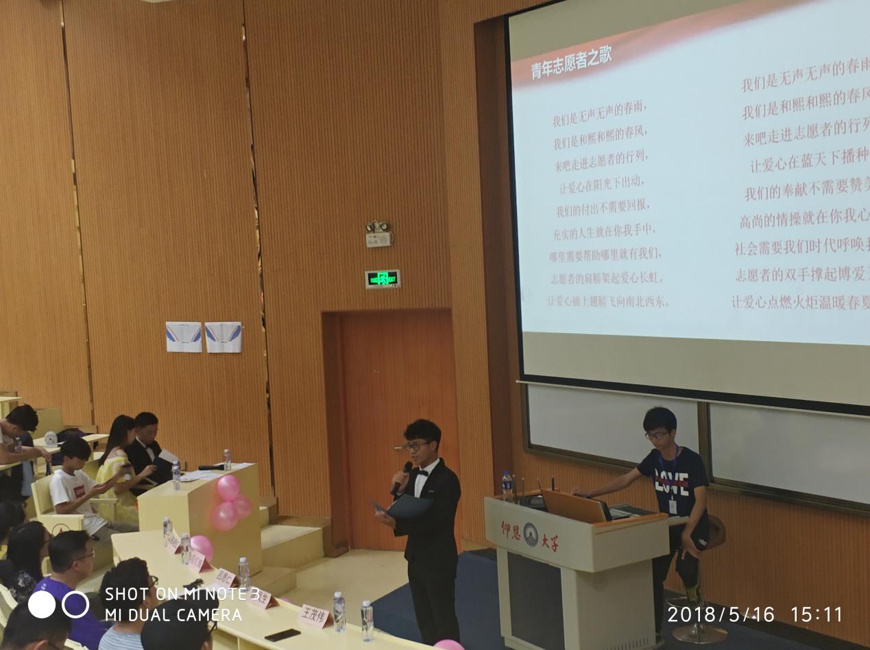 活动开始,首先是由学生代表领唱,全体学生合唱《感恩的心》,紧接着是公益经典朗诵《青年志愿者之歌》和由主持人进行关于公益方面的常识抢答,同学们都非常积极的参与其中,表现出了极高的热情和踊跃。