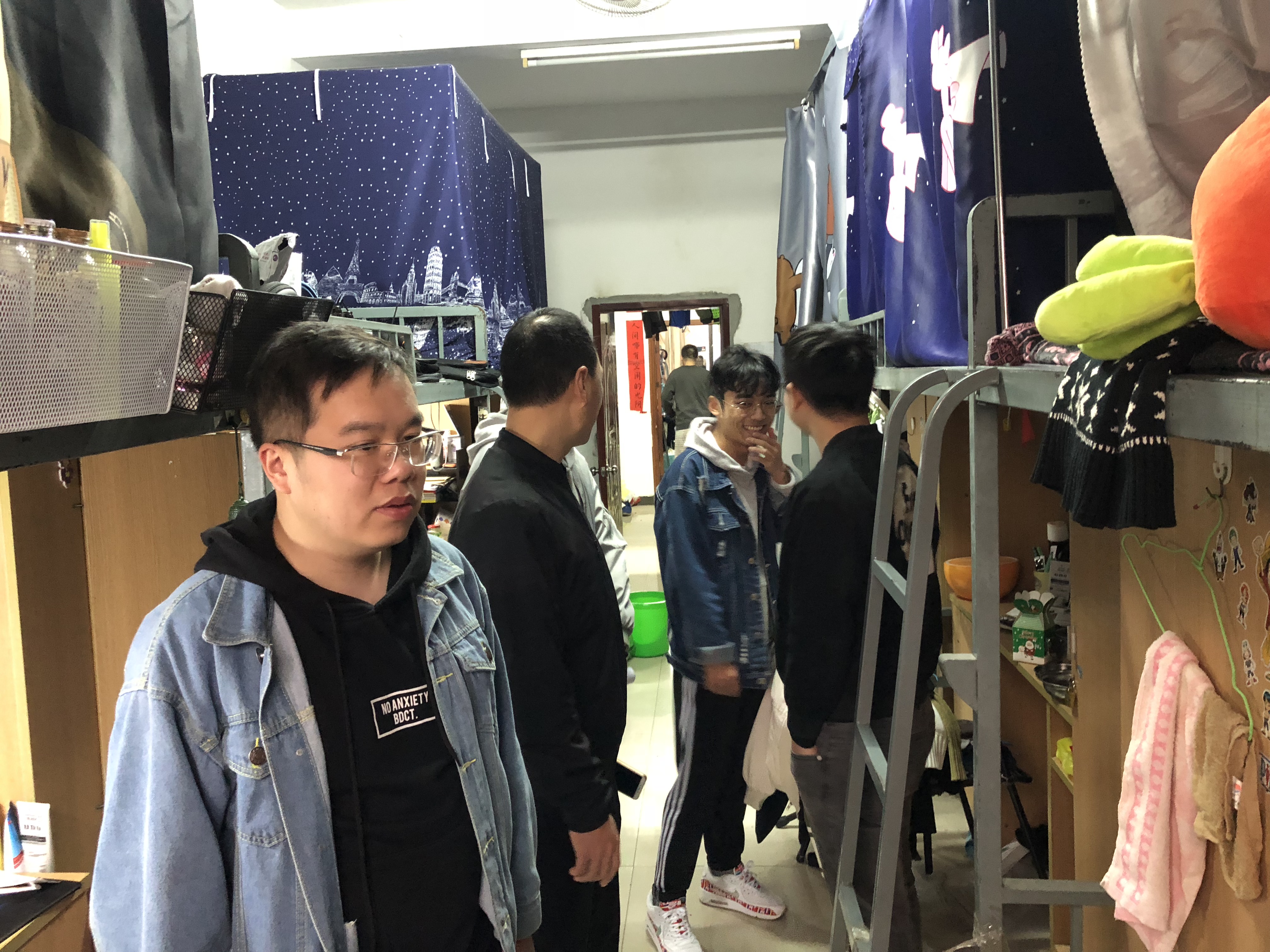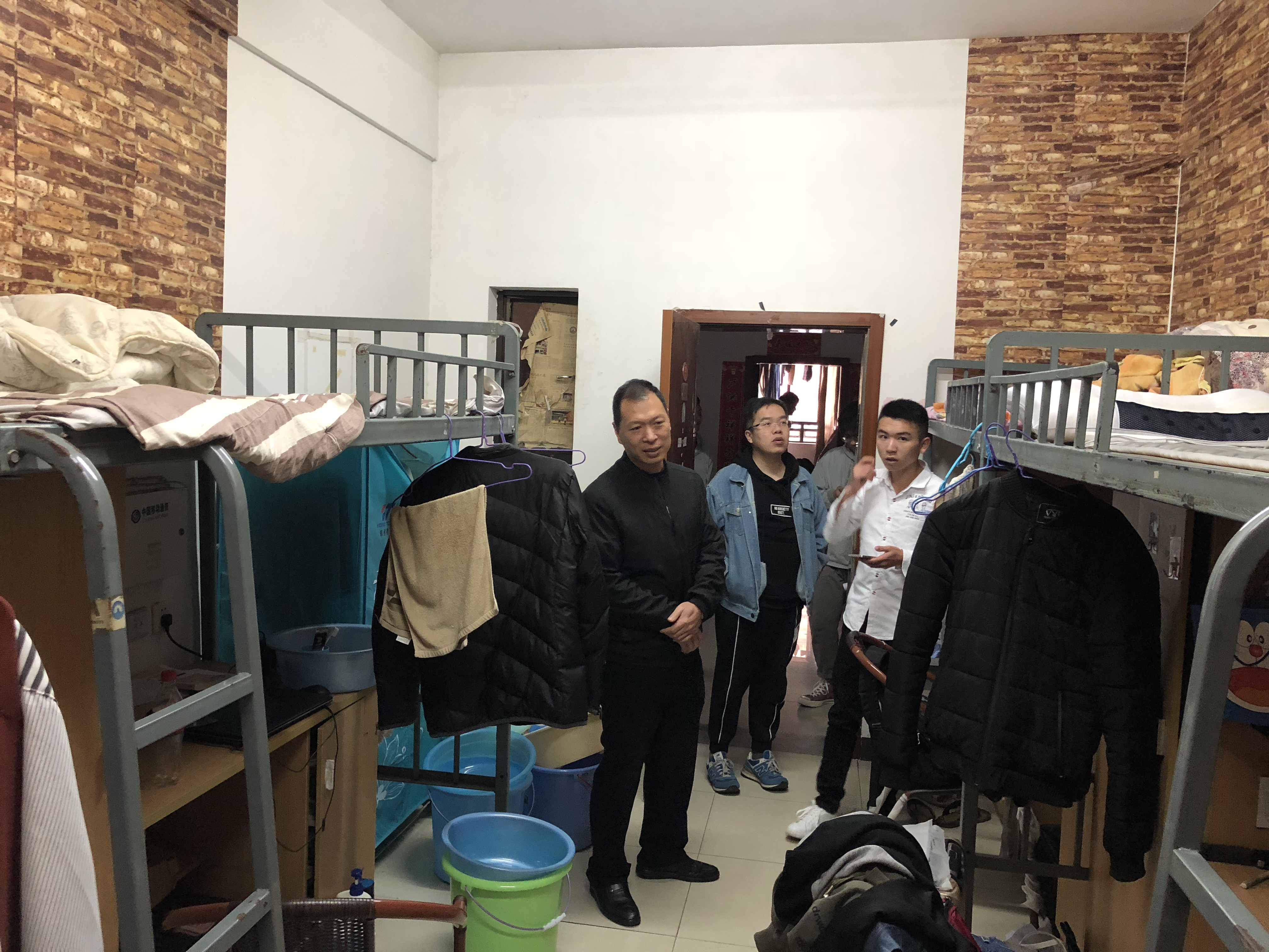 逐楼、逐层、逐间走进学生宿舍检查消防安全、宿舍卫生,排查安全隐患。重点检查宿舍是否存在违章电器、超载用电、私拉电线、易燃易爆等物品,还查看了楼梯消防通道。期间与学生亲切交流,倾听学生心声,了解他们的学习、生活、思想动态。经检查发现,部分学生宿舍存在私拉插线板、离开未断电源的安全隐患,部分学生宿舍存在空气异味重、物品摆放杂乱、堆放垃圾、个人物品占用楼道等问题。针对存在的问题,曾凤生强调指出,相关负责人要认真梳理存在问题,明确责任,限期整改,坚决排除各种安全隐患,住楼辅导员要组织人员对学生宿舍不定期开展安全检查,及时教育提醒广大学生要提高安全意识,要对自己和他人的生命和财产安全负责。