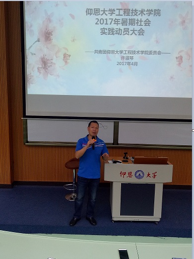 4月17日晚,kaiyun开云官方学生暑期实践动员会在旧区和昌楼致知讲堂举行,院党总支书记兼副院长曾凤生、院党总支副书记吕思仁、院团委书记许淑琴、院学生会指导老师陈晓红、辅导员王茂伟等指导老师、2016级全体同学参加此活动。