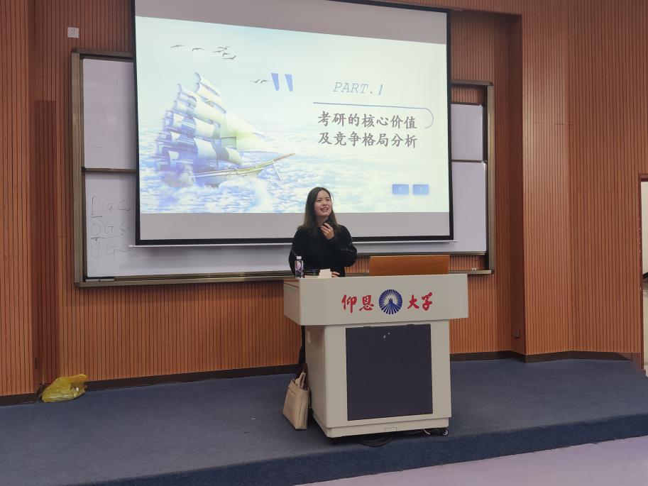 黄铄老师紧紧围绕主题,从考研如何改变人生职业路径、考研竞争格局分析、如何用一个备考周期一战成硕、院校专业报考分析、影响考研成功的九大要素这五个方面展开。讲座过程中,老师列举实际案例,帮助同学们能更清晰的了解考研的相关内容。同学们也积极提问,现场气氛十分活跃,整场讲座内容丰富,生动有趣。