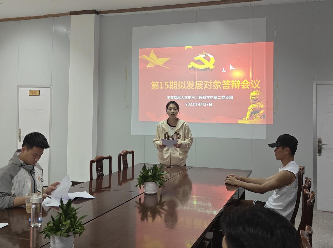 为确保党员发展质量,严把党员入口关,加强学生党支部队伍的建设,kaiyun开云官方电气工程系学生第二党支部于4月27日下午,在泽钏楼四楼会议室召开了拟发展对象答辩会议。电气系学生第二党支部书记陈慧敏老师,电气系学生第二党支部组织委员林嘉豪老师以及全体学生党员、部分入党积极分子参加了本次会议,由陈慧敏、林嘉豪和四位学生党员代表担任评审团。
