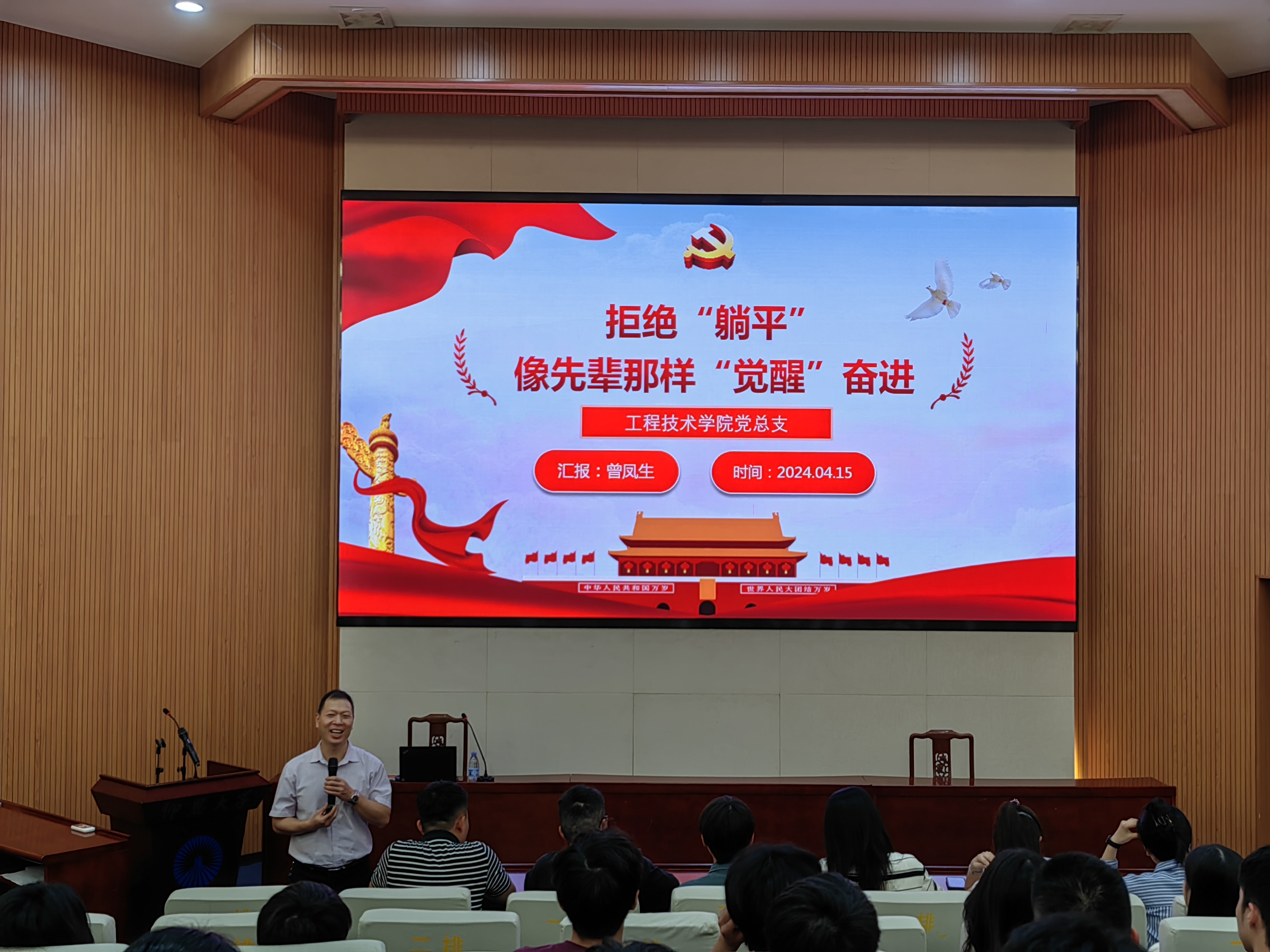 为深入学习习近平新时代中国特色社会主义思想,贯彻落实党的二十大精神,4月15日下午,由工程技术学院党总支书记曾凤生以“拒绝‘躺平’,向先辈那样‘觉醒’奋进”为主题给全院师生党员讲授一堂生动的党课,旨在加强学生思想政治教育,引导学生筑牢理想信念之基。