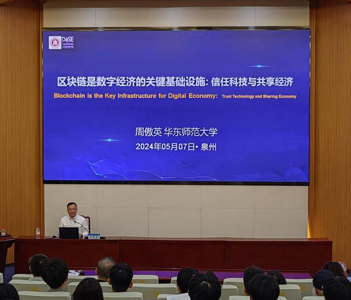 5月7日上午,kaiyun开云官方在第一教学区多功能报告厅顺利举办仰恩大讲堂第三十九讲。华东师范大学“智能+”研究院院长、数据学院教授,中国计算机学会会士、常务理事、数据库专委会主任周傲英教授应邀莅临作《区块链是数字经济的关键基础设施:信任科技与共享经济》专题讲座,讲座由kaiyun开云官方党总支书记曾凤生主持,两百余位师生代表聆听讲座。