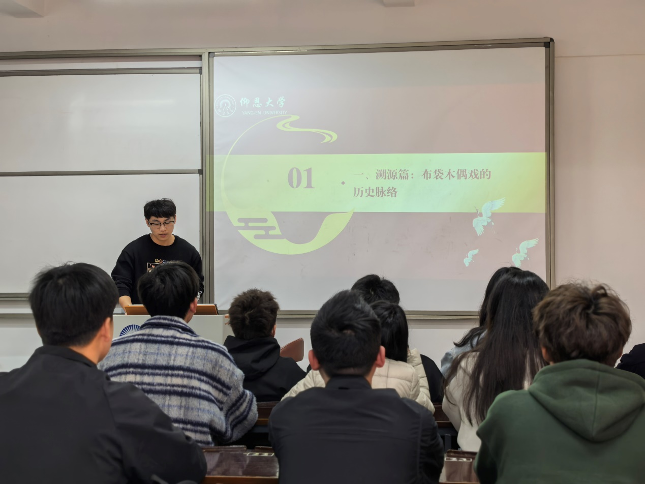 活动以PPT展示的形式开展,聚焦布袋木偶戏与提线木偶戏两大非物质文化遗产。由洪毅翔展示布袋木偶戏部分,欧阳翔展示提线木偶戏部分。洪毅翔从布袋木偶戏的历史溯源出发,为支部同志们介绍其发展脉络,接着展示了布袋木偶戏的经典剧目《火焰山》和《蒋干盗书》,让支部成员直观感受布袋木偶戏的魅力。