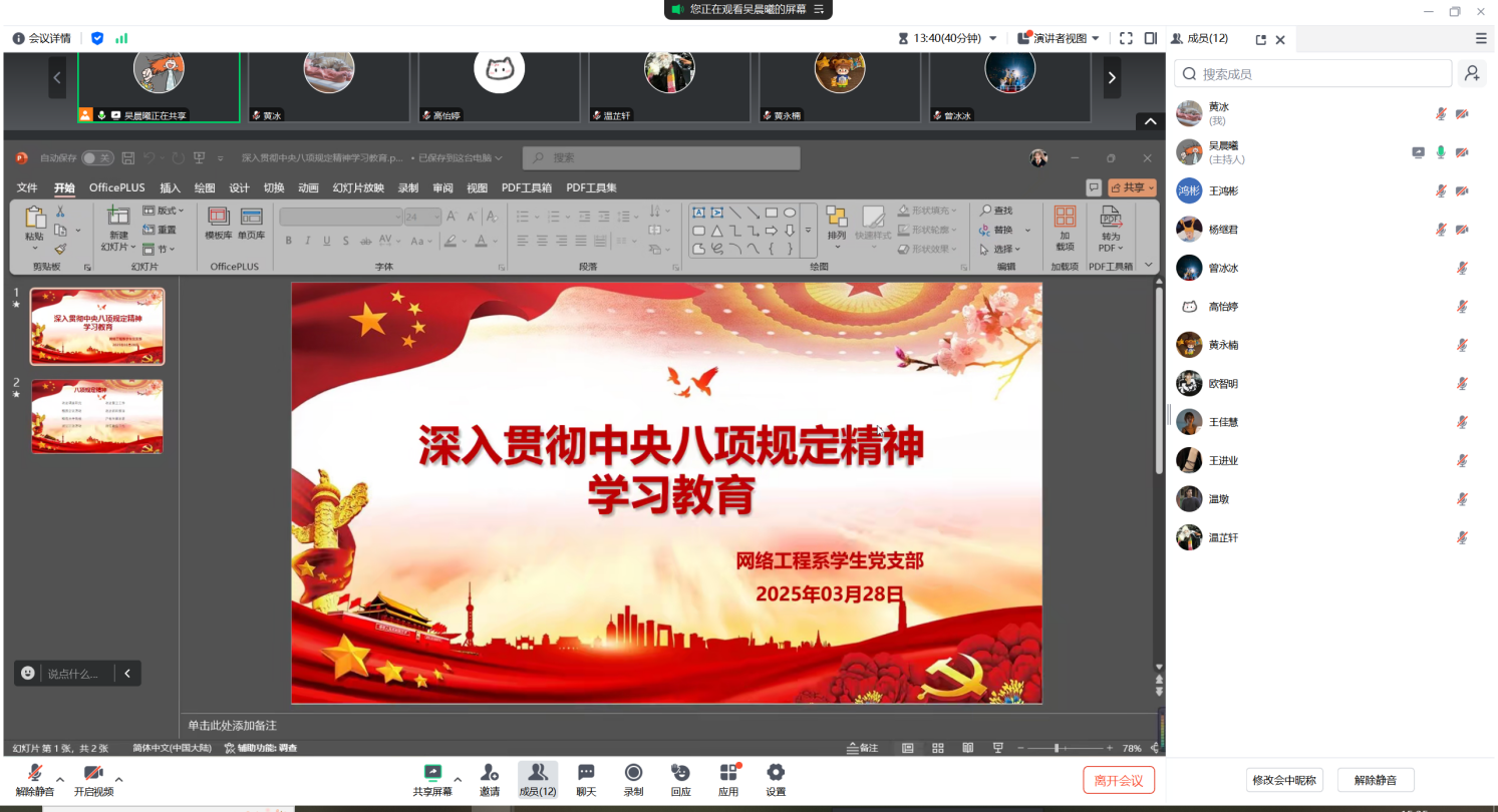 2025328日,网络工程系学生党支部通过线上会议,召开了深入贯彻中央八项规定精神学习教育的学习动员会。此次会议旨在进一步加强党风廉政建设,严明纪律规矩,推动八项规定精神在支部内深入人心、落地生根。
