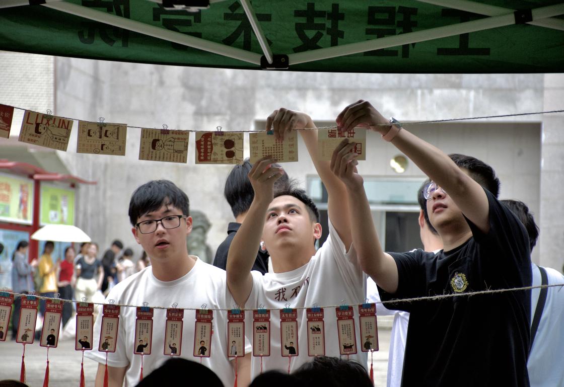 笔尖传情致敬百年风华。“百年对话墙”成为青年学子的“精神告白台”,参与者可誊抄青年励志经典语录,也可书写原创感悟,展现青年积极向上的担当精神,最终现场收集100余份寄语悬挂成“红色星河”。“掌廓留青”环节,参与者描绘手掌轮廓和签名,形成具有象征意义的青春印记墙。“码上读红书”活动以音频明信片为载体,106名青年对应五四运动106周年,生成专属二维码放入信封。这些承载着青年声波的“红色信使”投入红色信箱后,会在参与者中随机传递以实现跨时空的红色精神传承。
