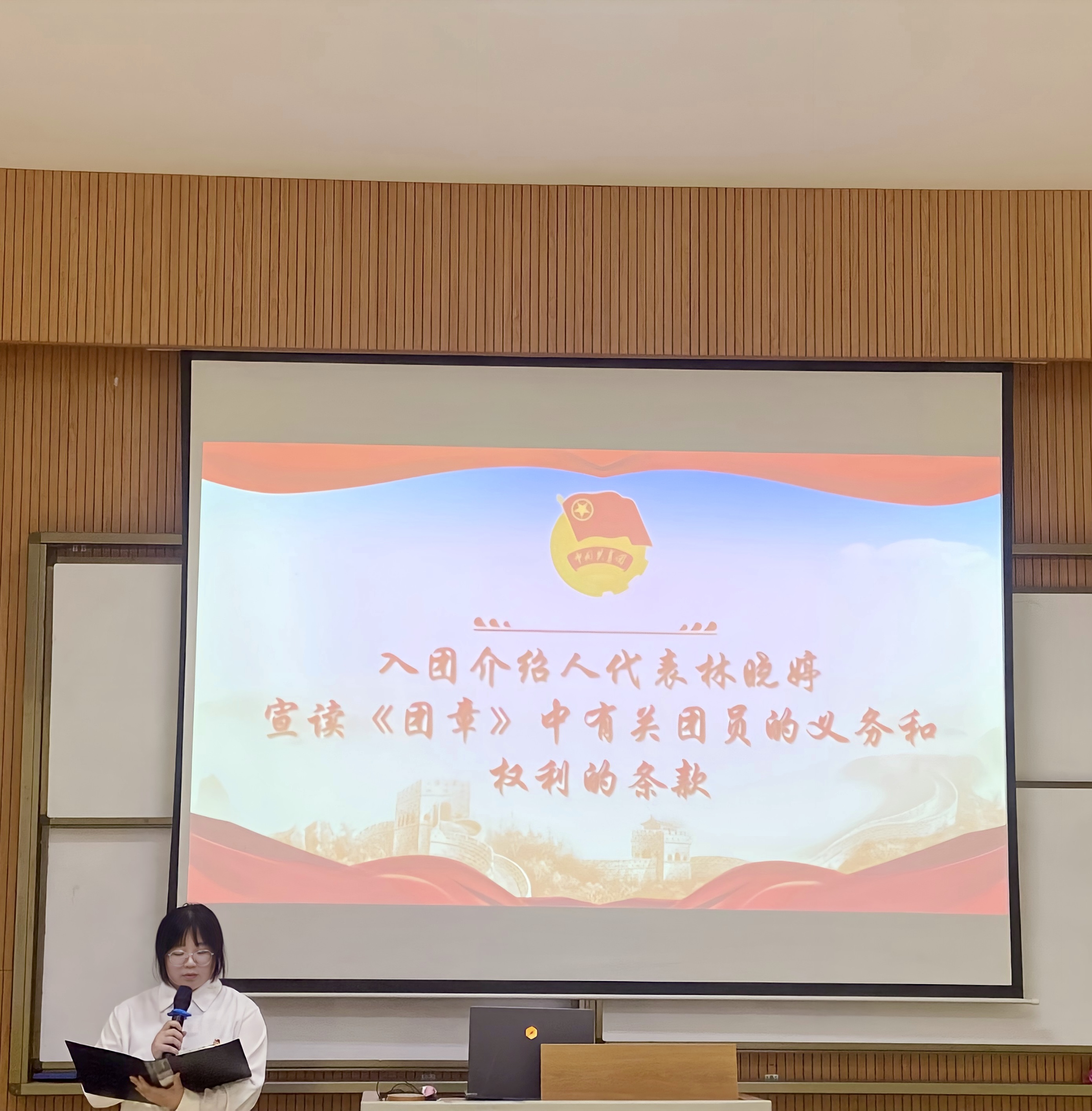 院团委叶嘉琪同学说明入团仪式的意义并宣读新团员名单。随后,院团委老师为新团员代表佩戴团徽和颁发团章、团员证。颁发礼后,在院团委刘培莹同学的带领下,全体新团员面向团旗庄严宣誓,老团员重温入团誓词。入团介绍人代表林晓婷宣读了《团章》中有关团员义务和权利的条款,帮助新团员明确使命。